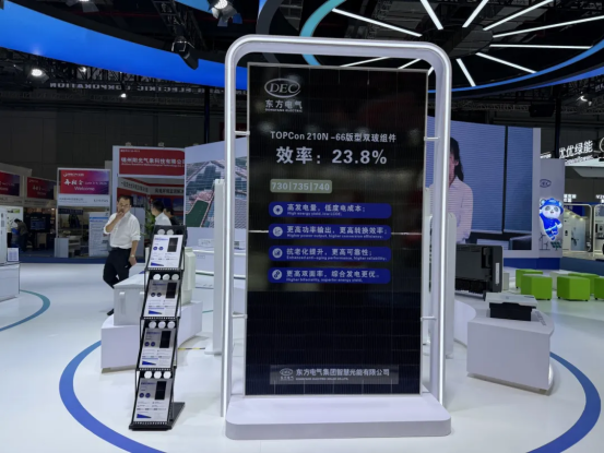 尊龙时凯人生就搏光能光伏组件系列产品,适用于分布式、地面电站、海上光伏等多应用场景,本次参展的DEC自主品牌TOPCon 210N-66版型半片双玻光伏组件,采用N型TOPCon电池技术,发电功率最高达740瓦,转换效率达到23.8%,电池技术和制造工艺位列行业前列,具有高发电量、低度电成本、高转化效率、高可靠性、优秀的抗衰减能力、综合发电更优等特点。
